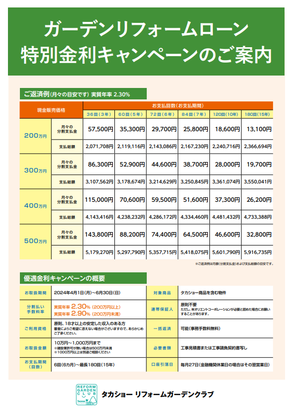 お支払いは6回(6ヶ月)から180回(15年)まで対応。お申込み時の金利が完済時まで適応されます。