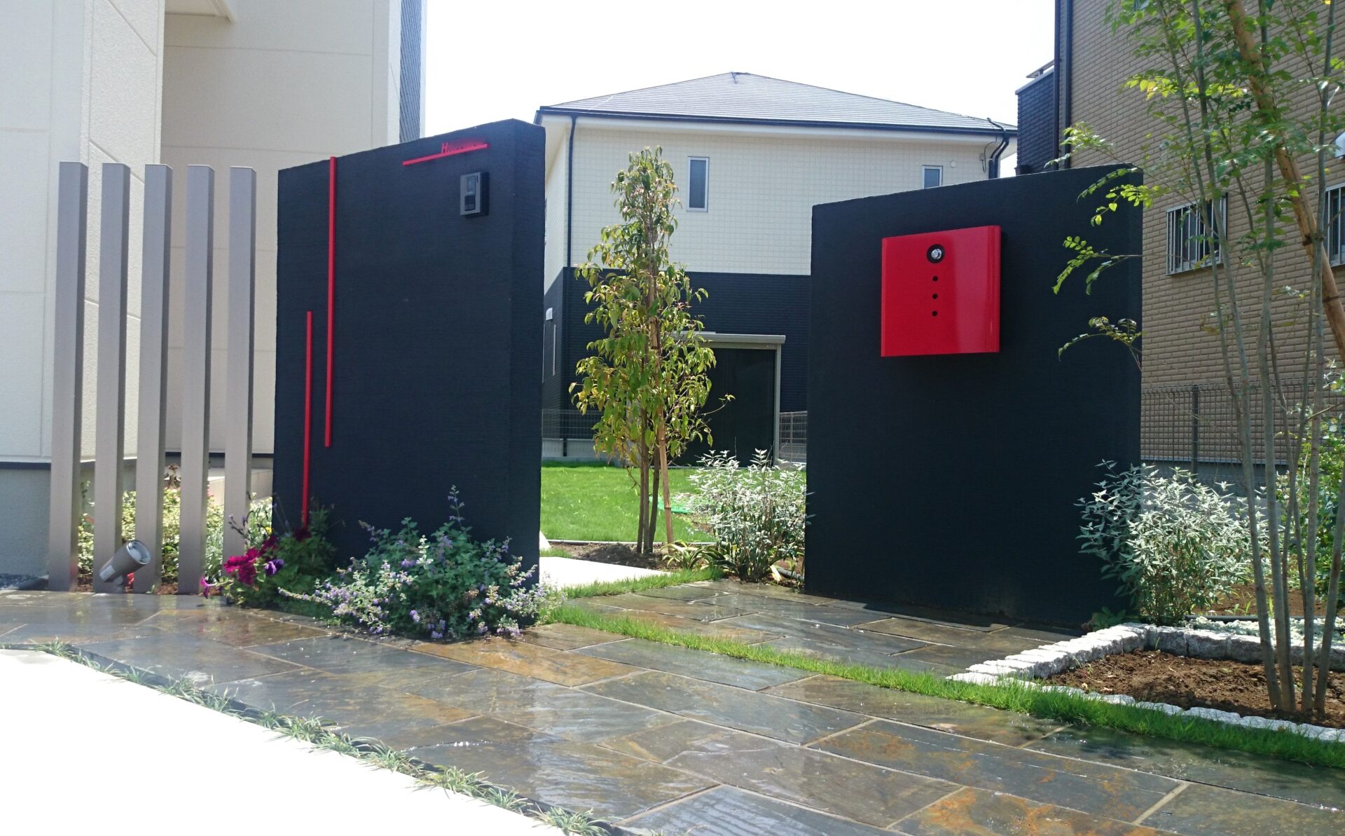 2枚の黒い門柱と赤色のラインが印象的なデザインの門まわり。