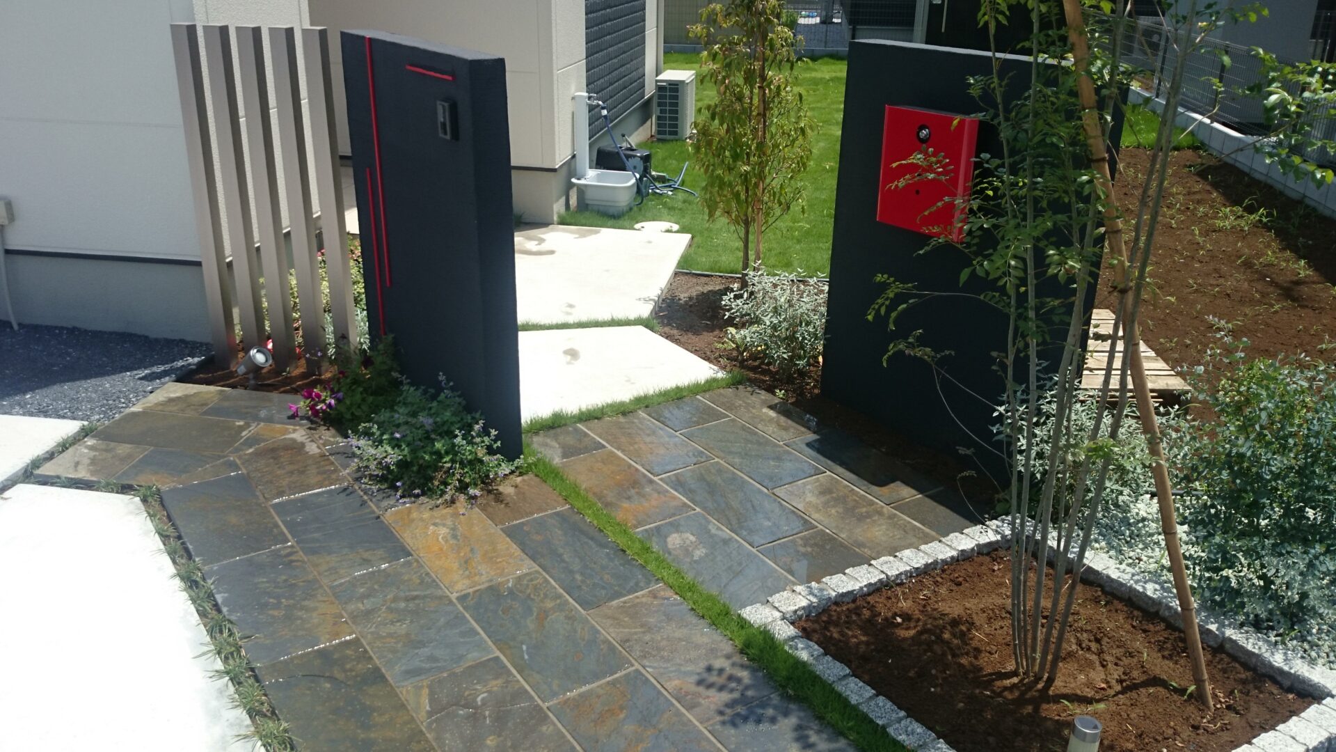 門柱を引き立てているのが、色幅が広く割肌が味わい深い フォーマルスレートです。