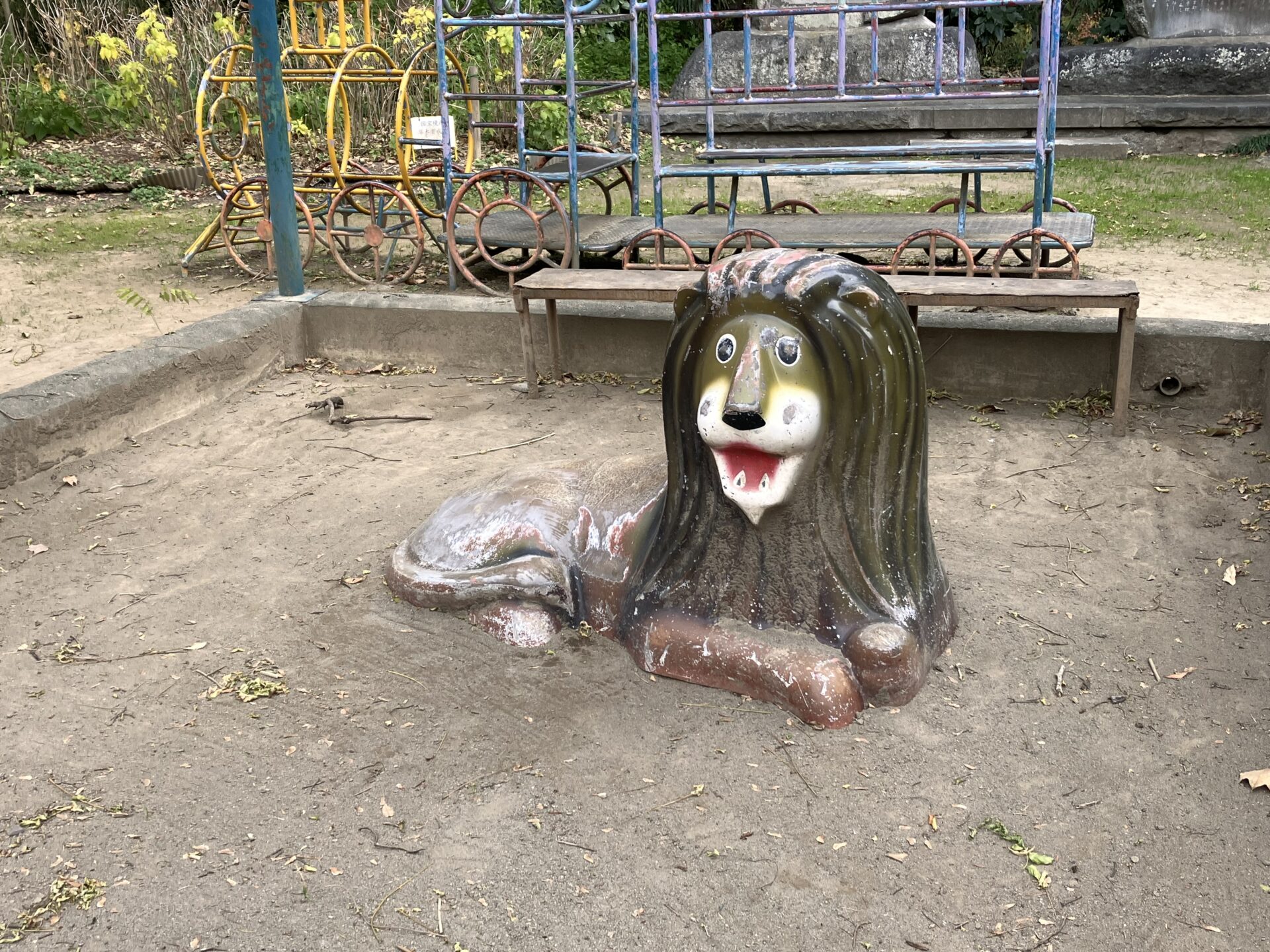 10mほど離れた砂場には、ボロボロなサラサラヘアライオンがいました。