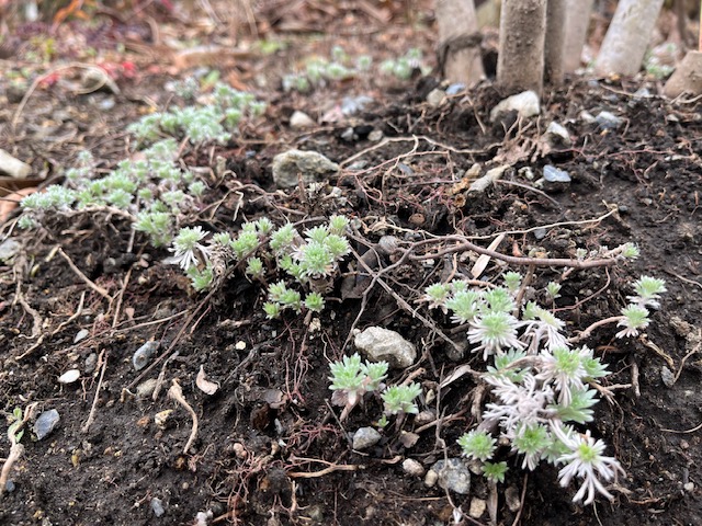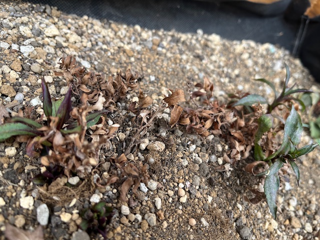 寒くなるにつれてどんどん元気が無くなって、見た目も悪くなっていたので、エコの「植物が元気になる菜園スペース」に移し様子を見ていたのですが、茎も葉も枯っ切ってしまったので一年草だったかな?と割り切ってた矢先、土から新たな葉っぱが出始めました🌱もう少し成長すれば、なんの植物だかも判るでしょう✨