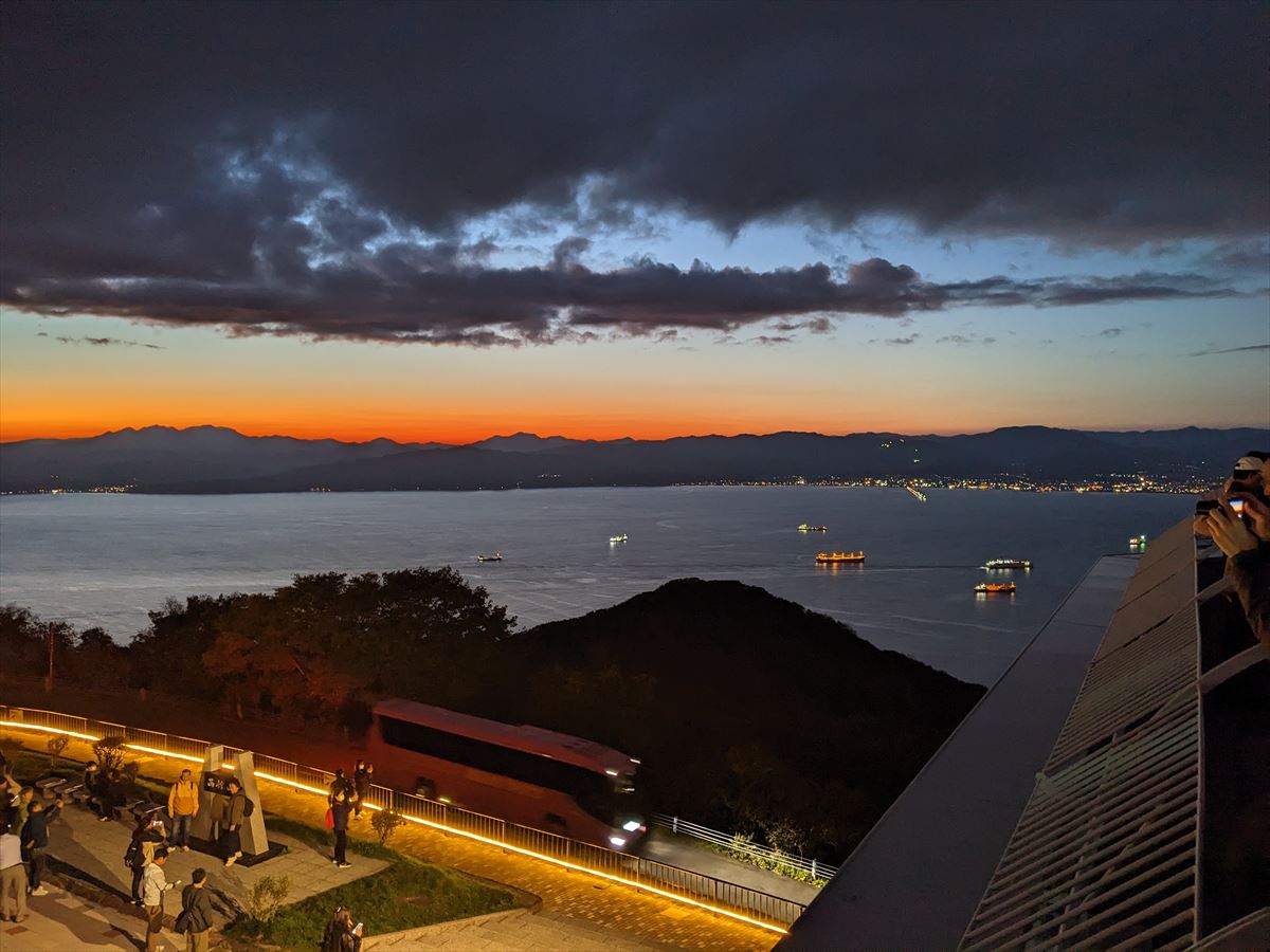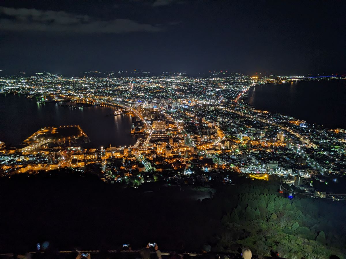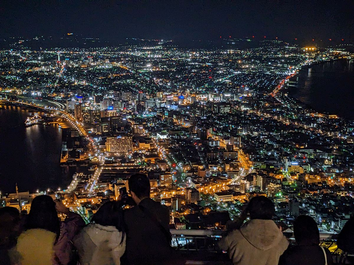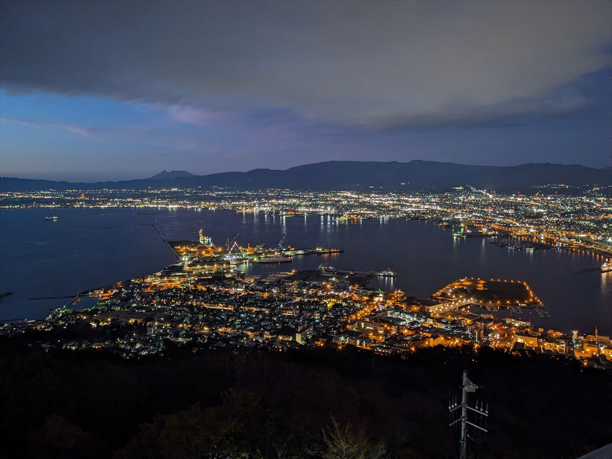 時間帯によって微妙に変化する様子や、函館港と津軽海峡に挟まれた町の姿が何とも言い難い景色です。