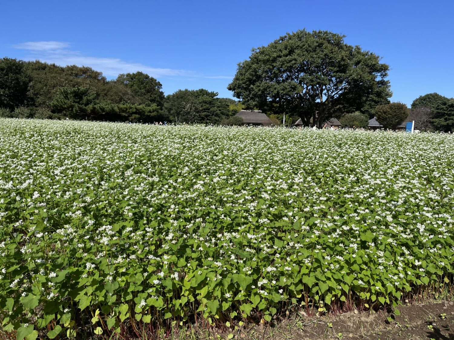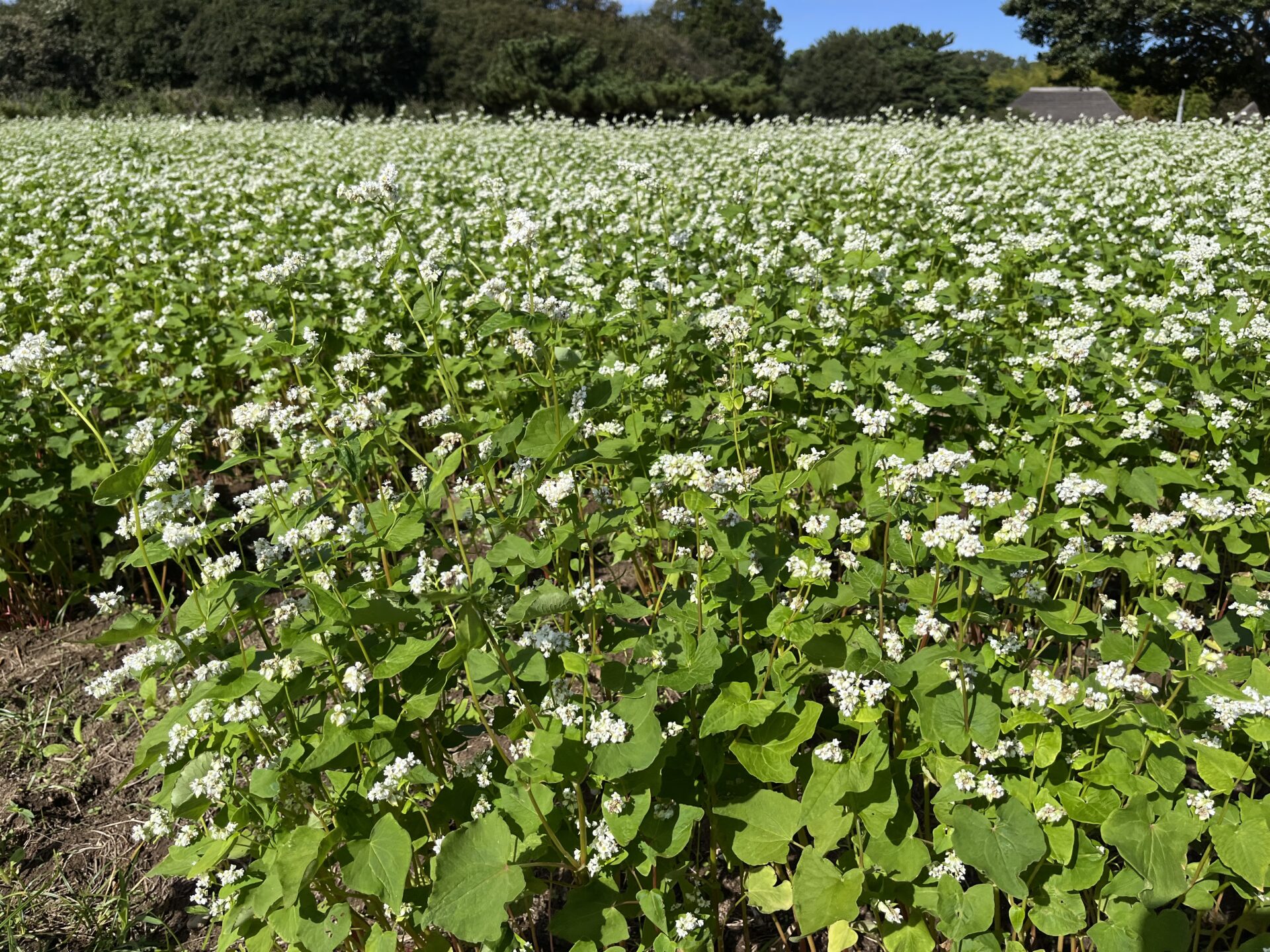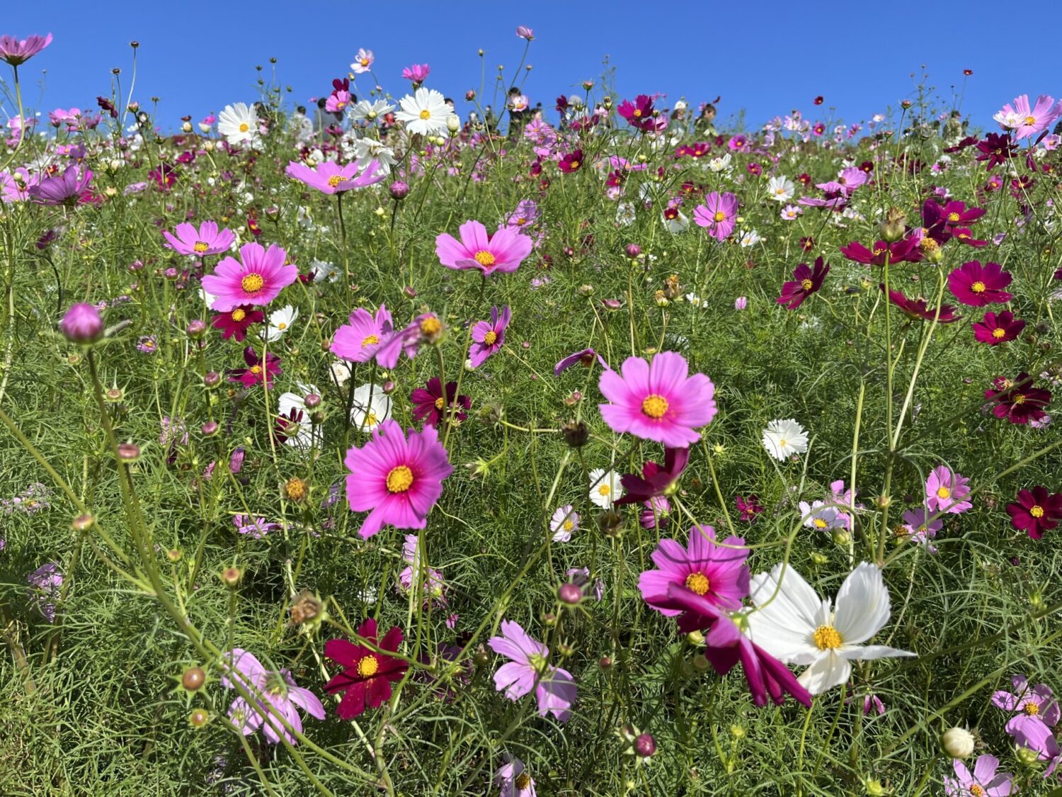 手前にはたくさんのコスモスと蕎麦の花とたくさんのお花が咲いていました。