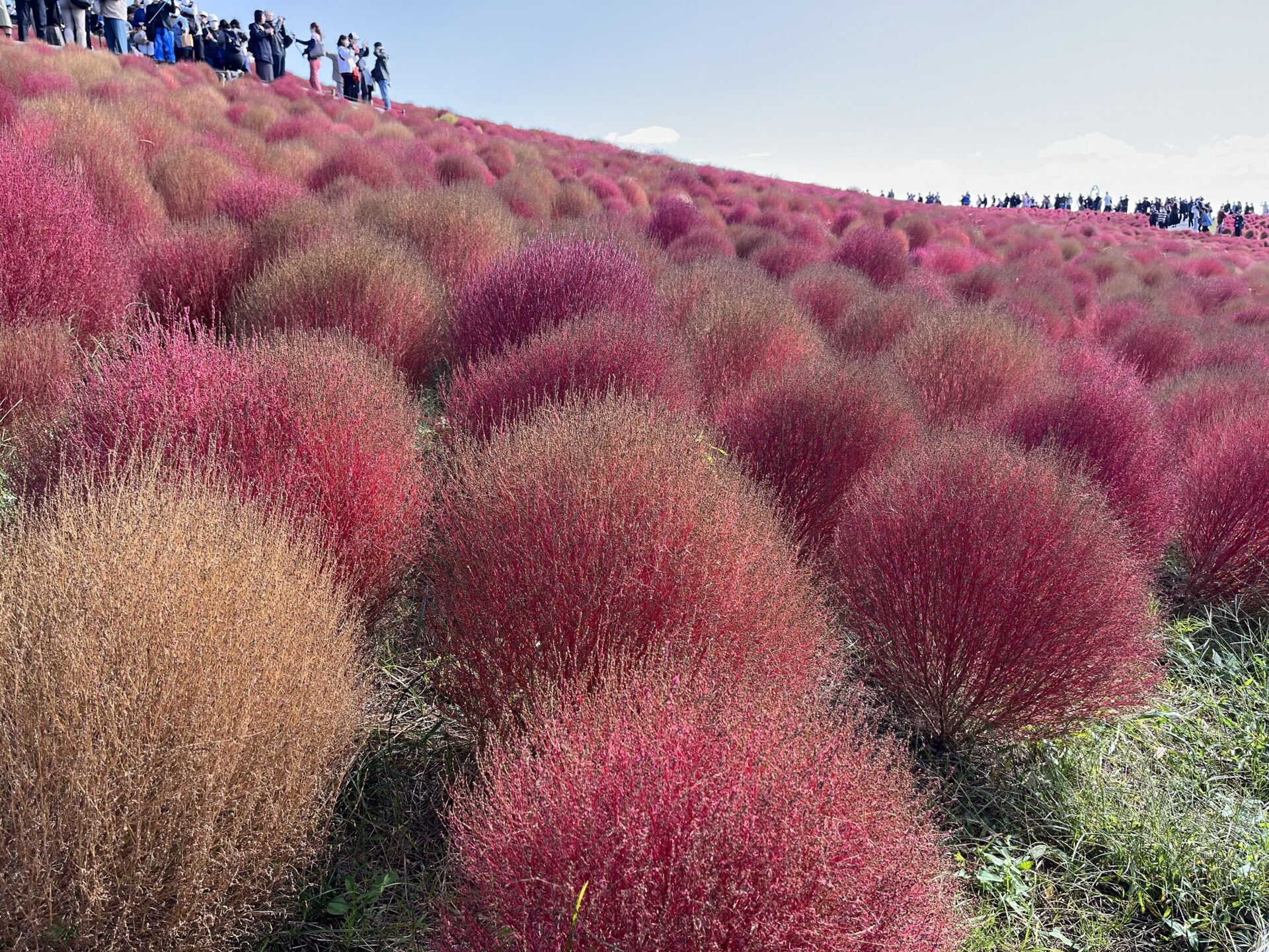 今年は既にコキアの見頃ピークは過ぎてしまいましたが、10月下旬~11月初旬には赤いコキアの色が抜けて、