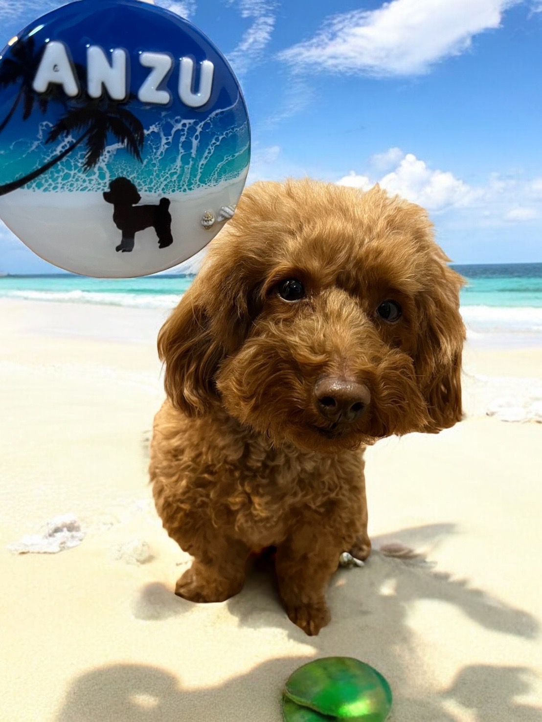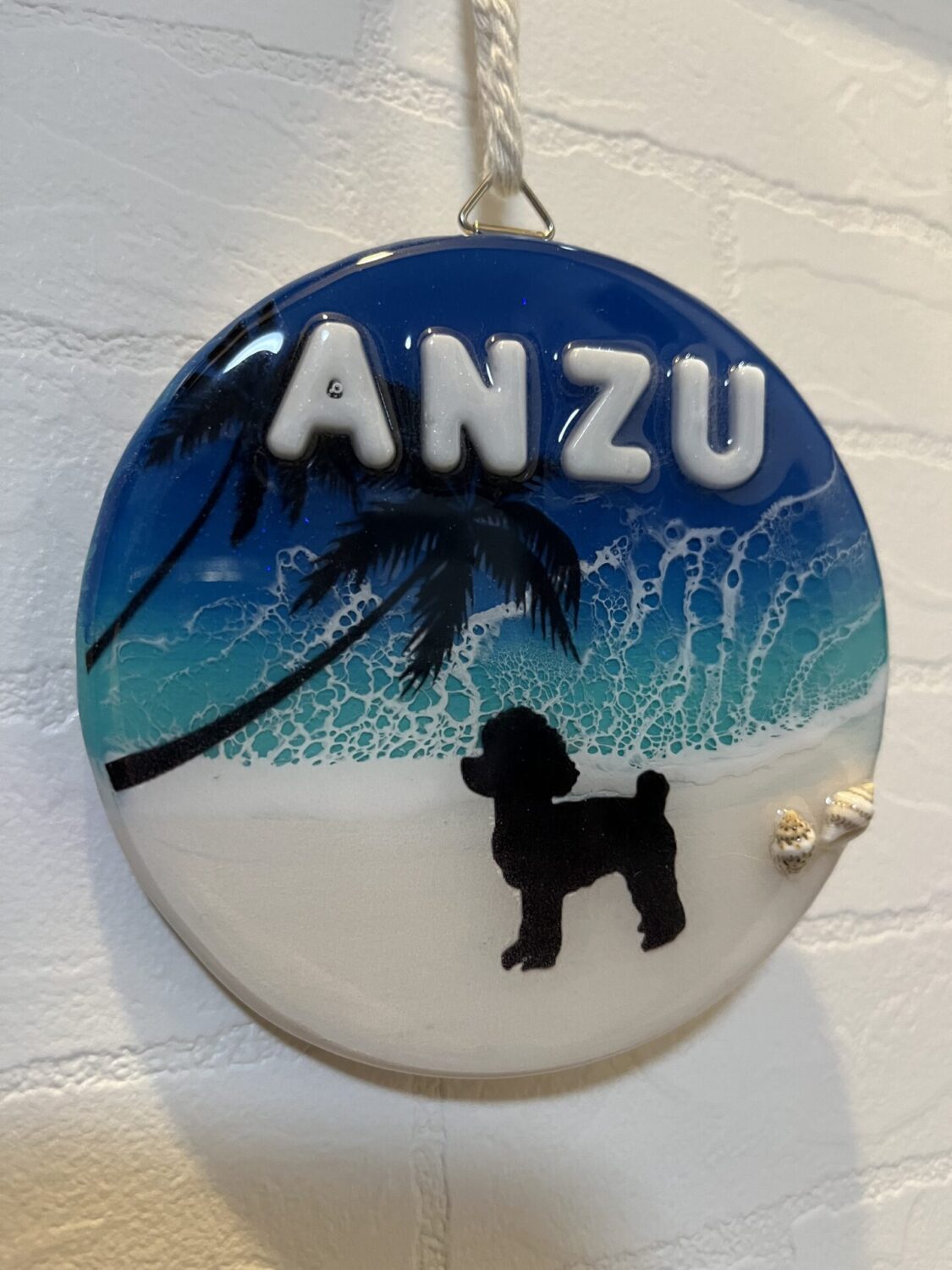 トイプードルのシルエット入りの丸形のプレートに愛犬の名前を入れて作成していただきました。