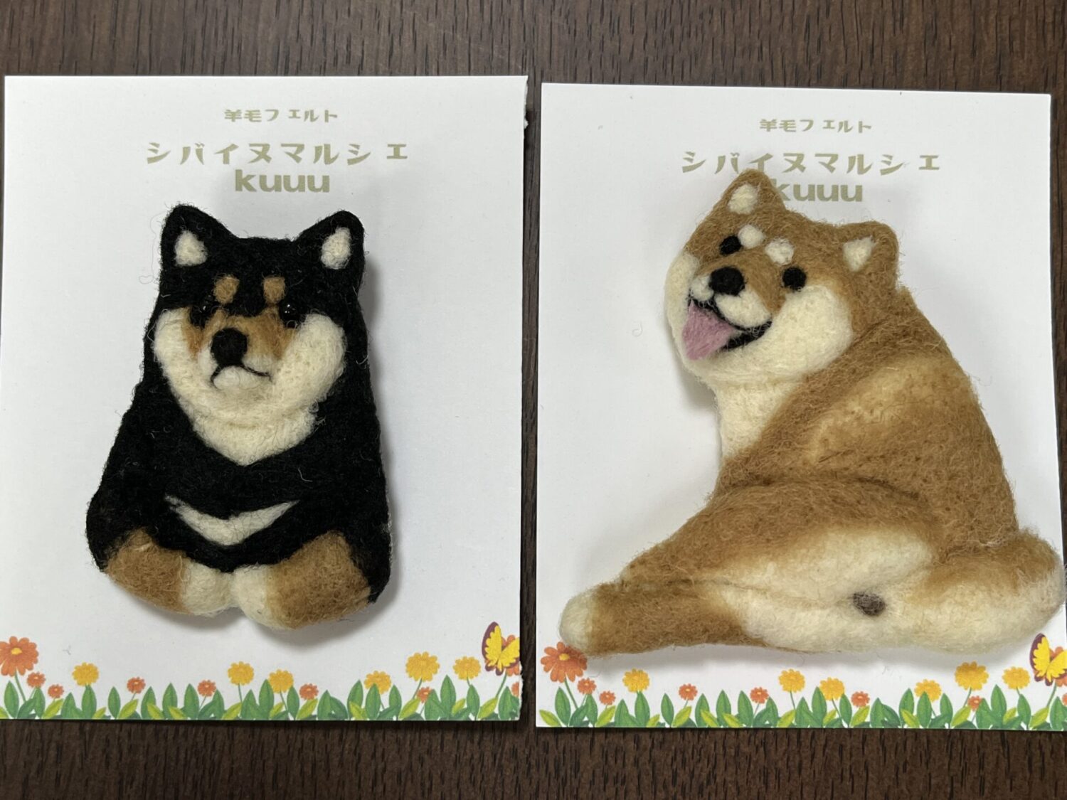 黒柴と茶柴の羊毛フェルトで作られたブローチです。