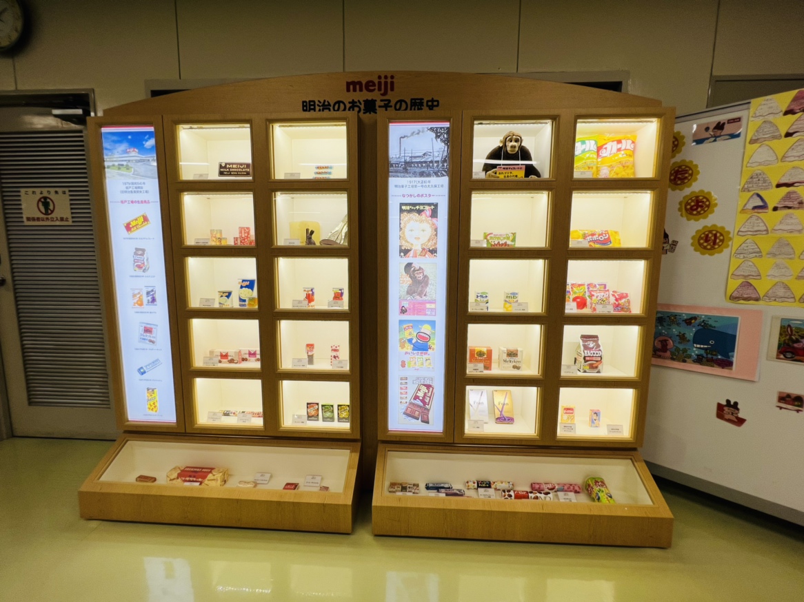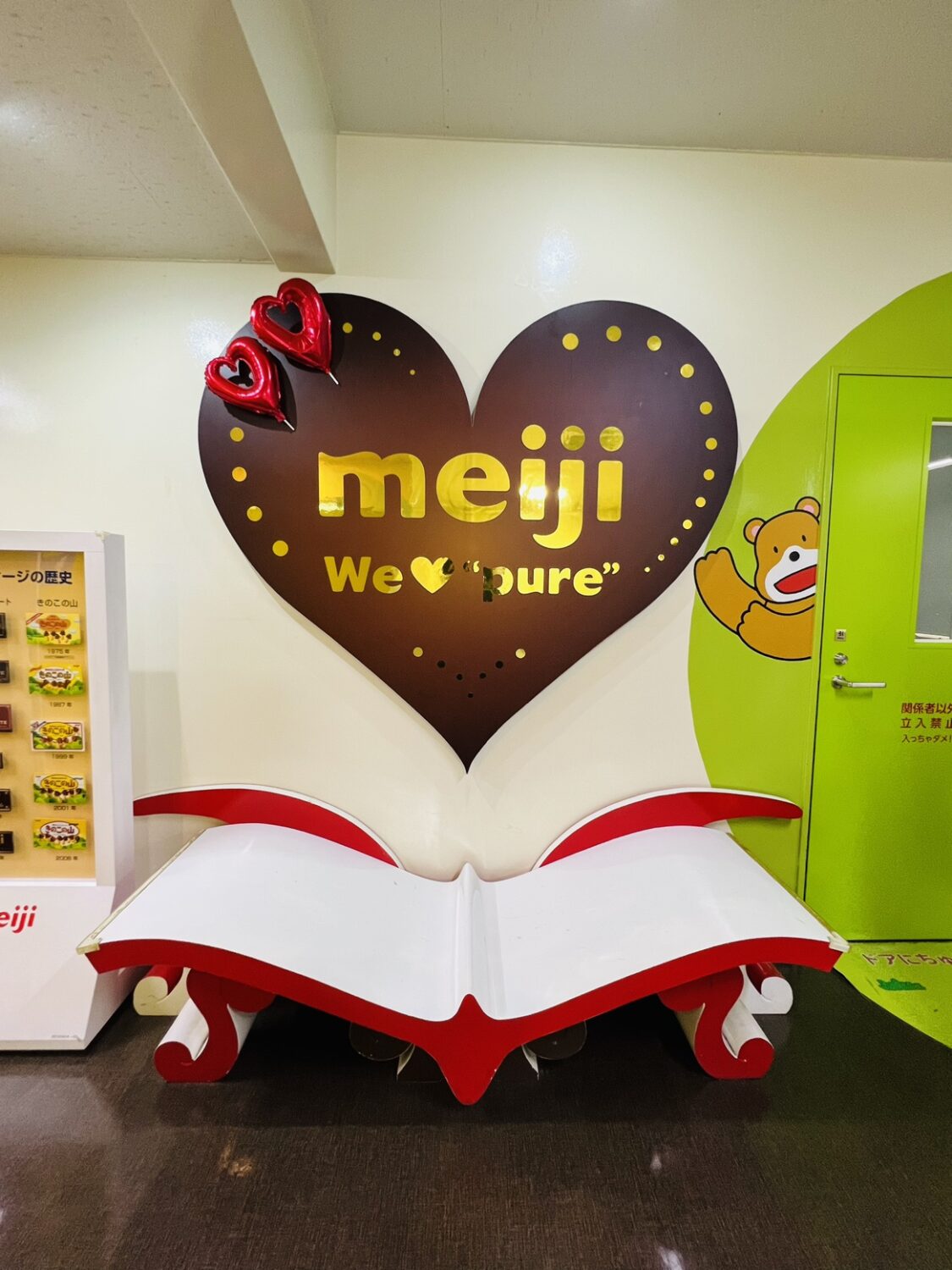 ホールには明治のお菓子の歴史が展示されています。またフォトスポットもありました。