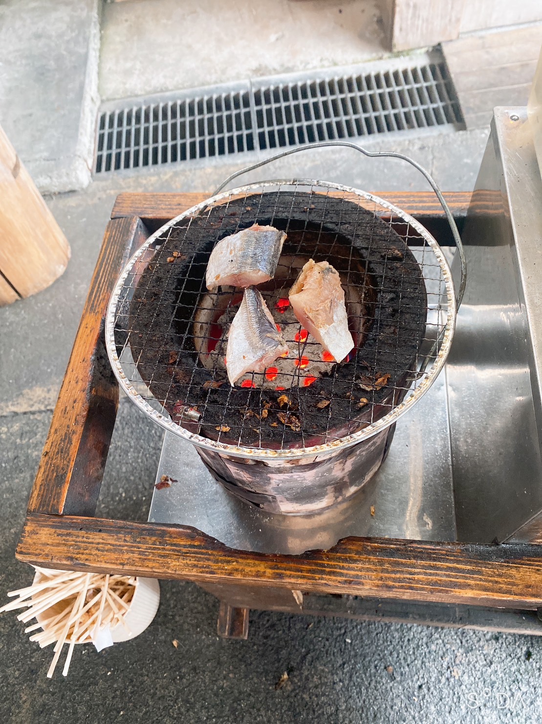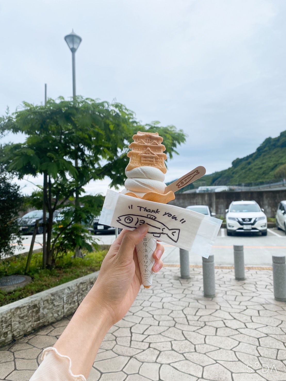 小田原城をモチーフにしたソフトクリームも、七輪で焼く干物の試食も