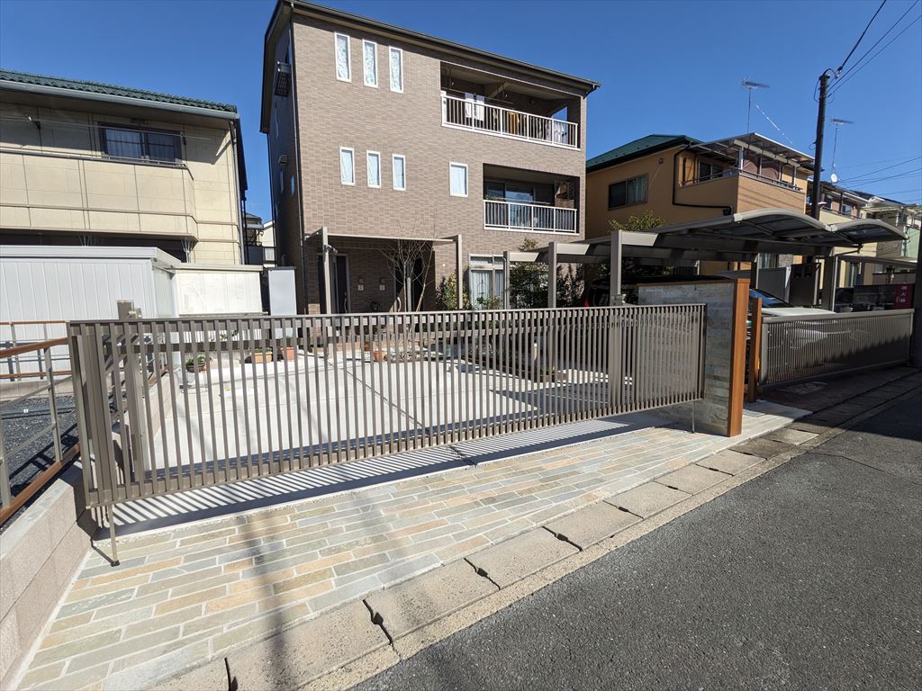 中央に二世帯分の門柱、左側に新たに2台分のカースペースを設けました。