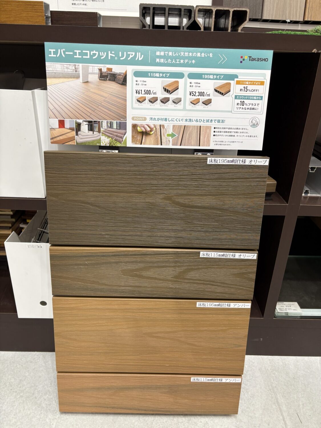 ウッドデッキのエバーエコウッドリアルは新商品の195㎜幅があります。