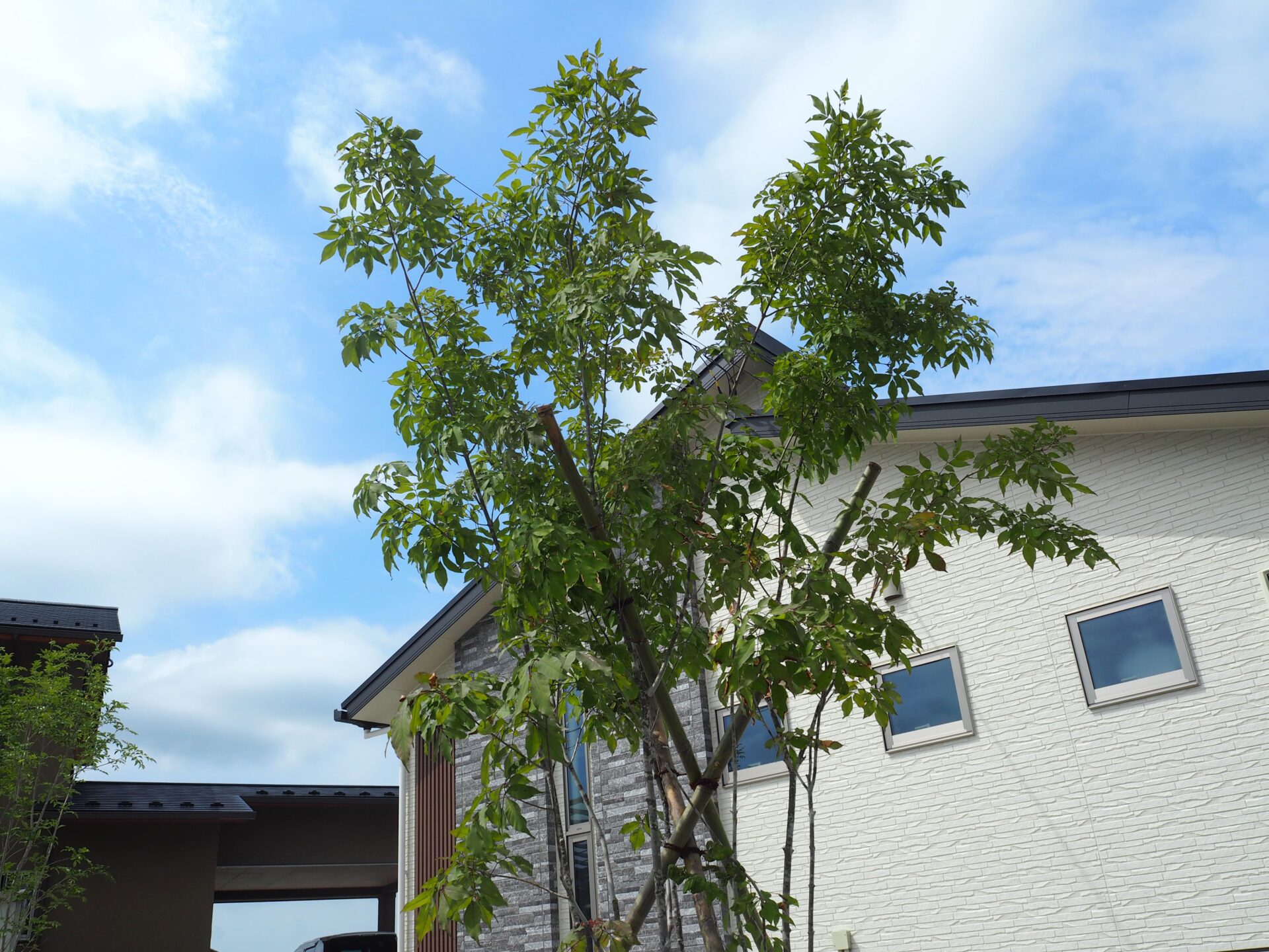 石調の外壁手前には、デザインアクセントとしてシンボルツリーのシマトネリコを植樹しました。