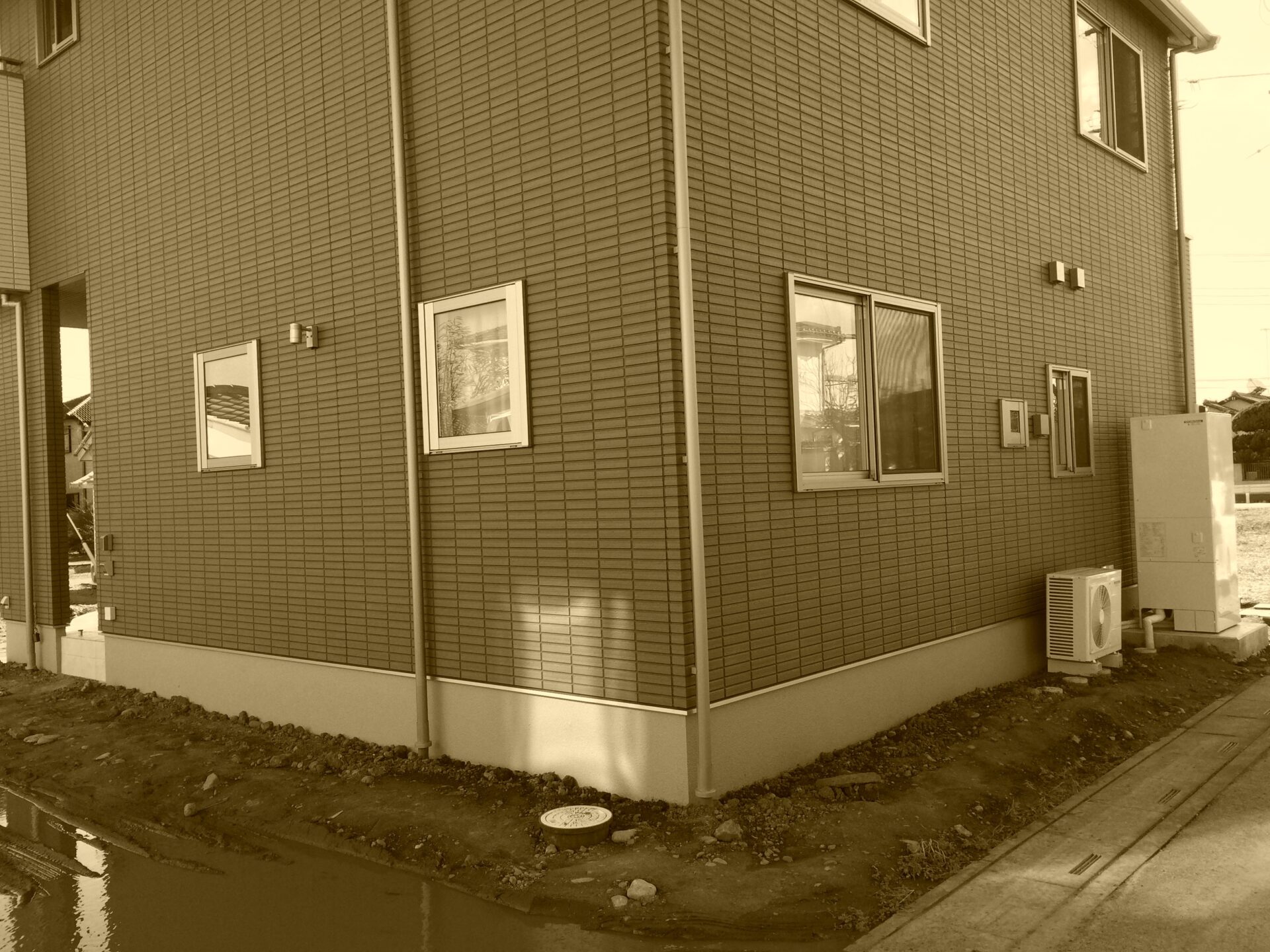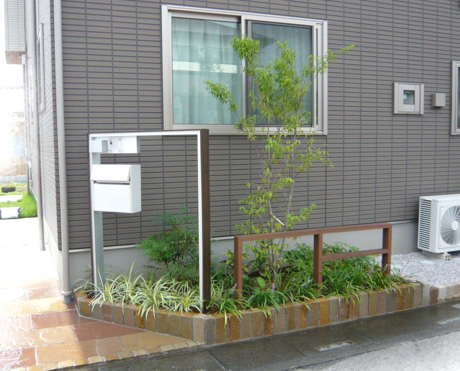 植栽部分を道路面より少し高くし、窓前を樹木でゆるく目隠しとして設けました。