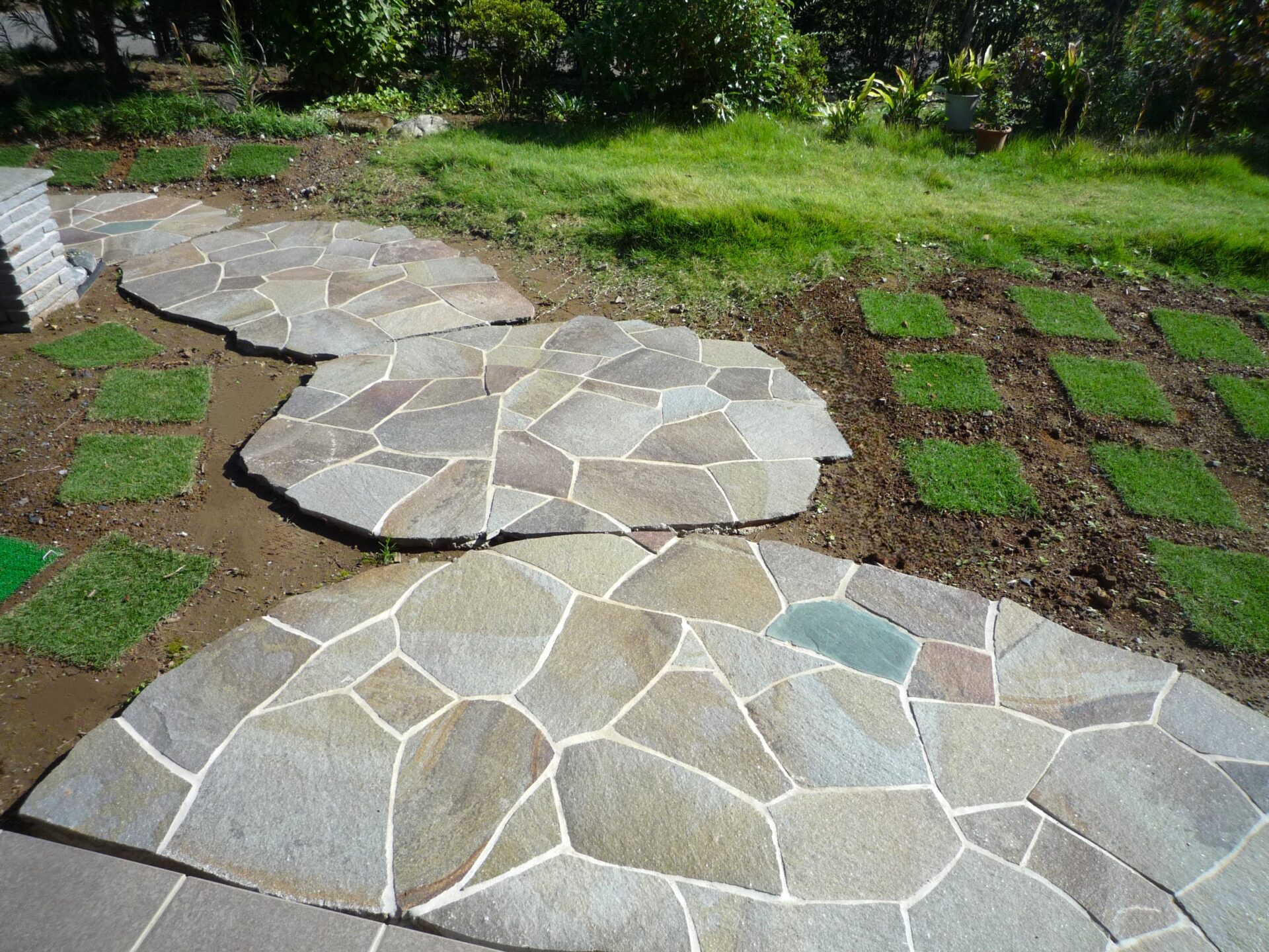 玄関へ続くアプローチには、鉄平石を使用しました。途中に数ヵ所スリットを入れてアクセントを付けました。