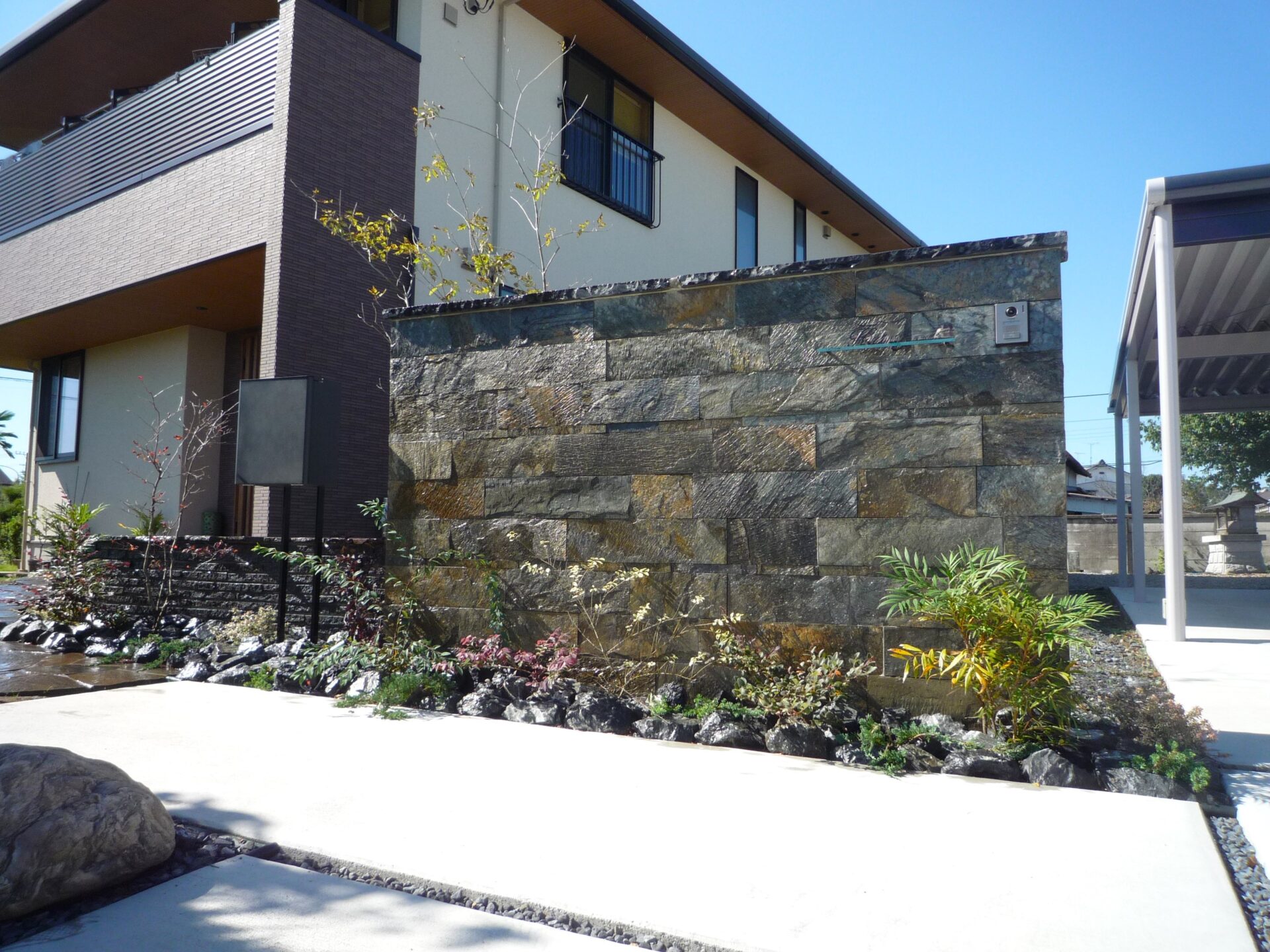メインの門柱の横には高さの低い鉄平石の壁を設けたことにより、デザイン的なアクセント兼、裏側から座ることもできる機能性もプラスしました。