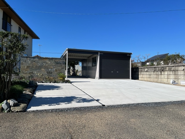 駐車場にはガレージを設置したので、大切なお客様のお車も雨・風などから守れて安心です。