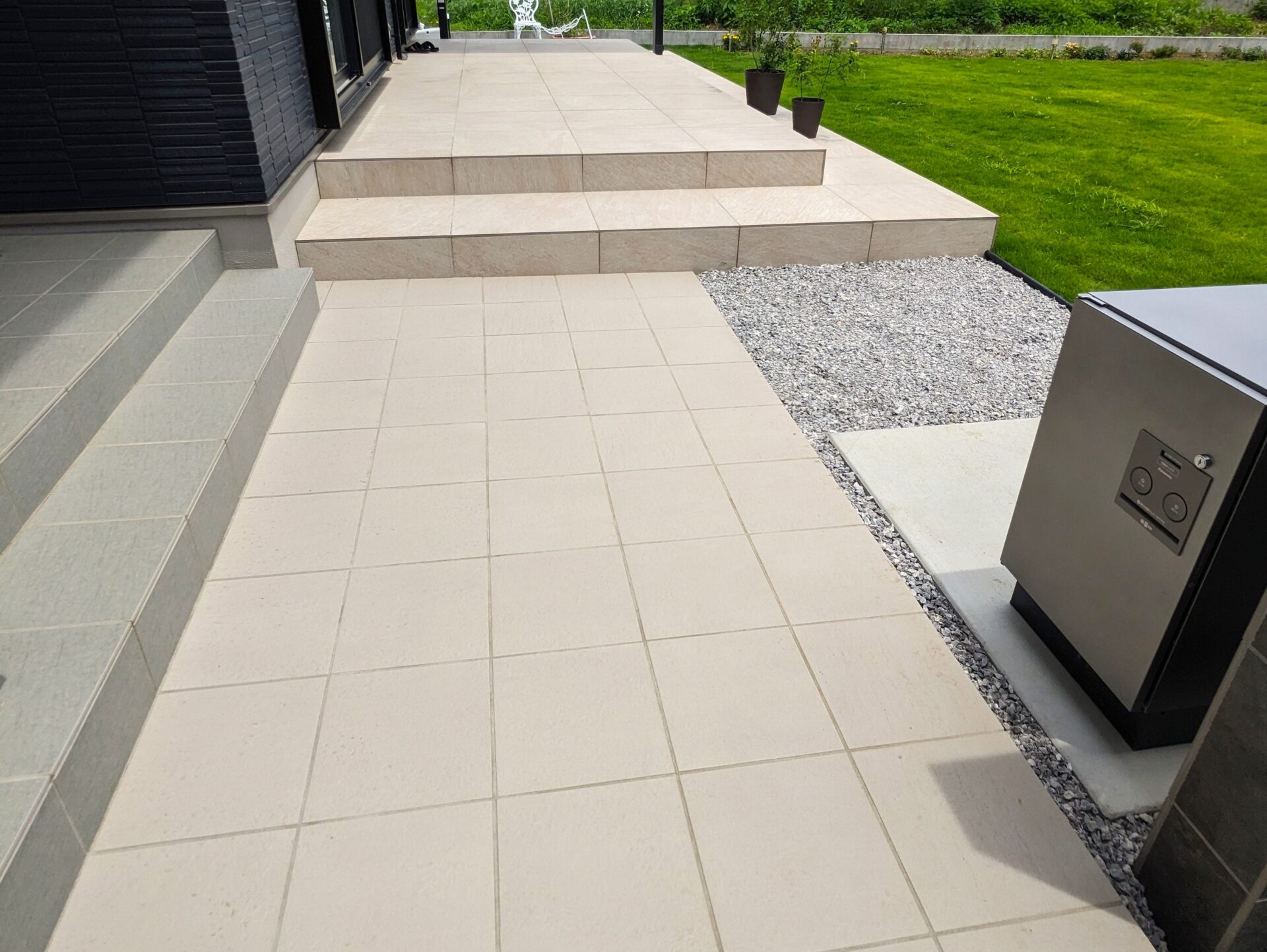 玄関前のスペースは既存のタイルの色違いを選択し、目地を合わせ、色も明るくしたことでアプローチとテラスにつながり感が生まれました。