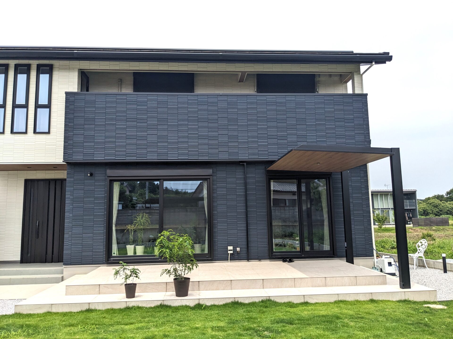 ご要望通り、イナバのアルシアを施工し、さらに打ち合わせの後半で話題に上がった、ジーポートProの折半屋根で軒天のパネルが木彫のアイテムに施主様が目が止まり、その重厚感とデザインをお気に召したので取り入れました。