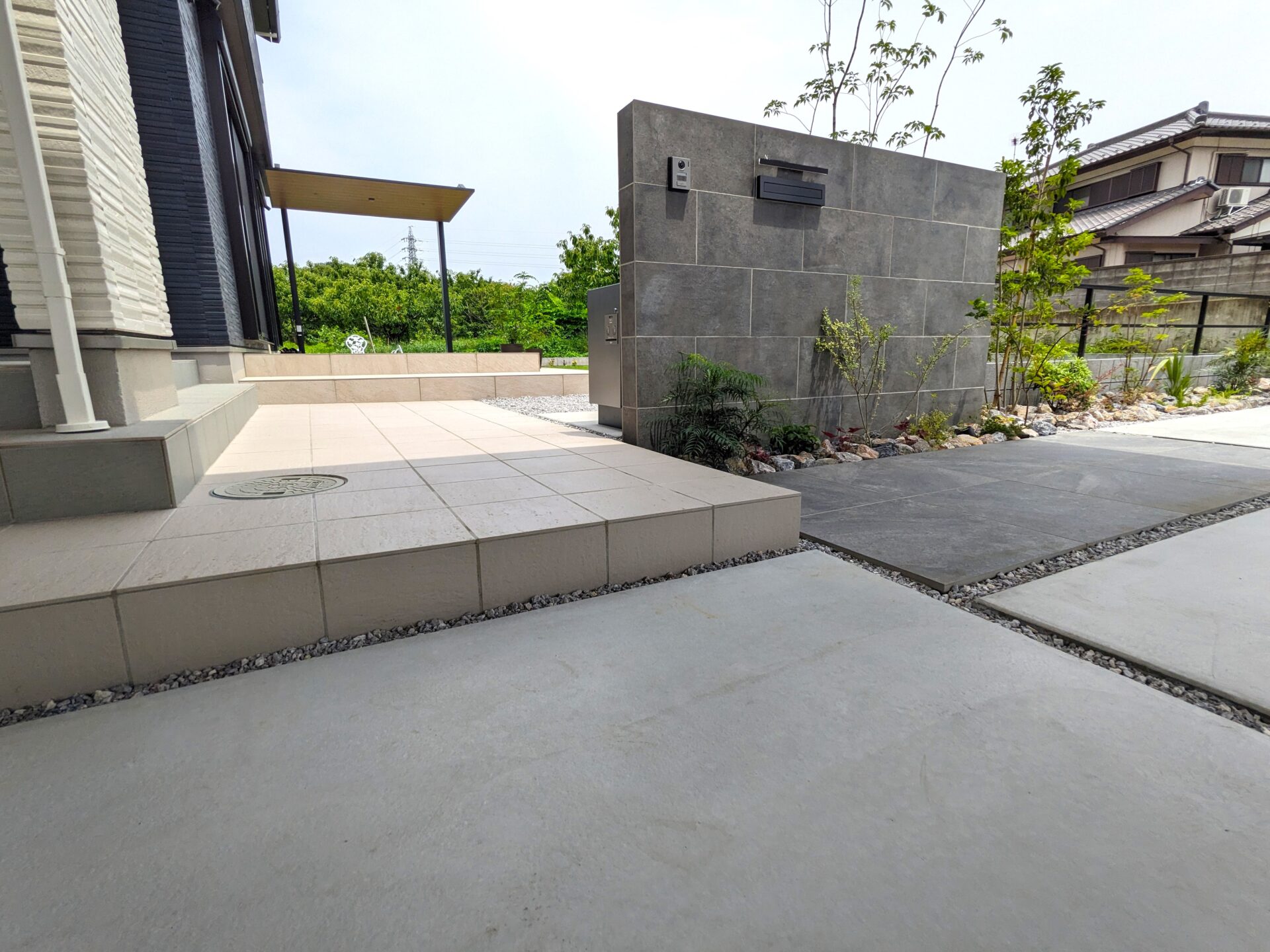タカショーのセラレバンテを使用したことで、独特の天然石調の質感が美しい洗練された印象の門柱に仕上がりました。また、グレーとブラックの2色展開でブラックを選択したことにより、お庭全体の印象がぐっと引き締まり、よりモダンでおしゃれな雰囲気になりました。