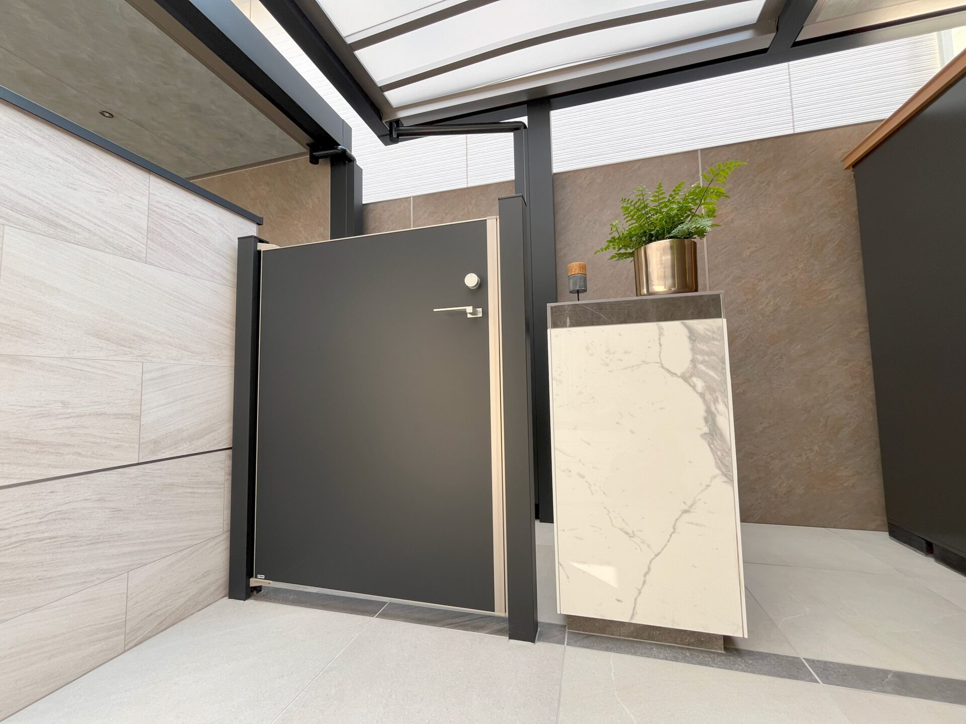 門扉もタカショーの「エバーアートボード門扉」にしたことにより、