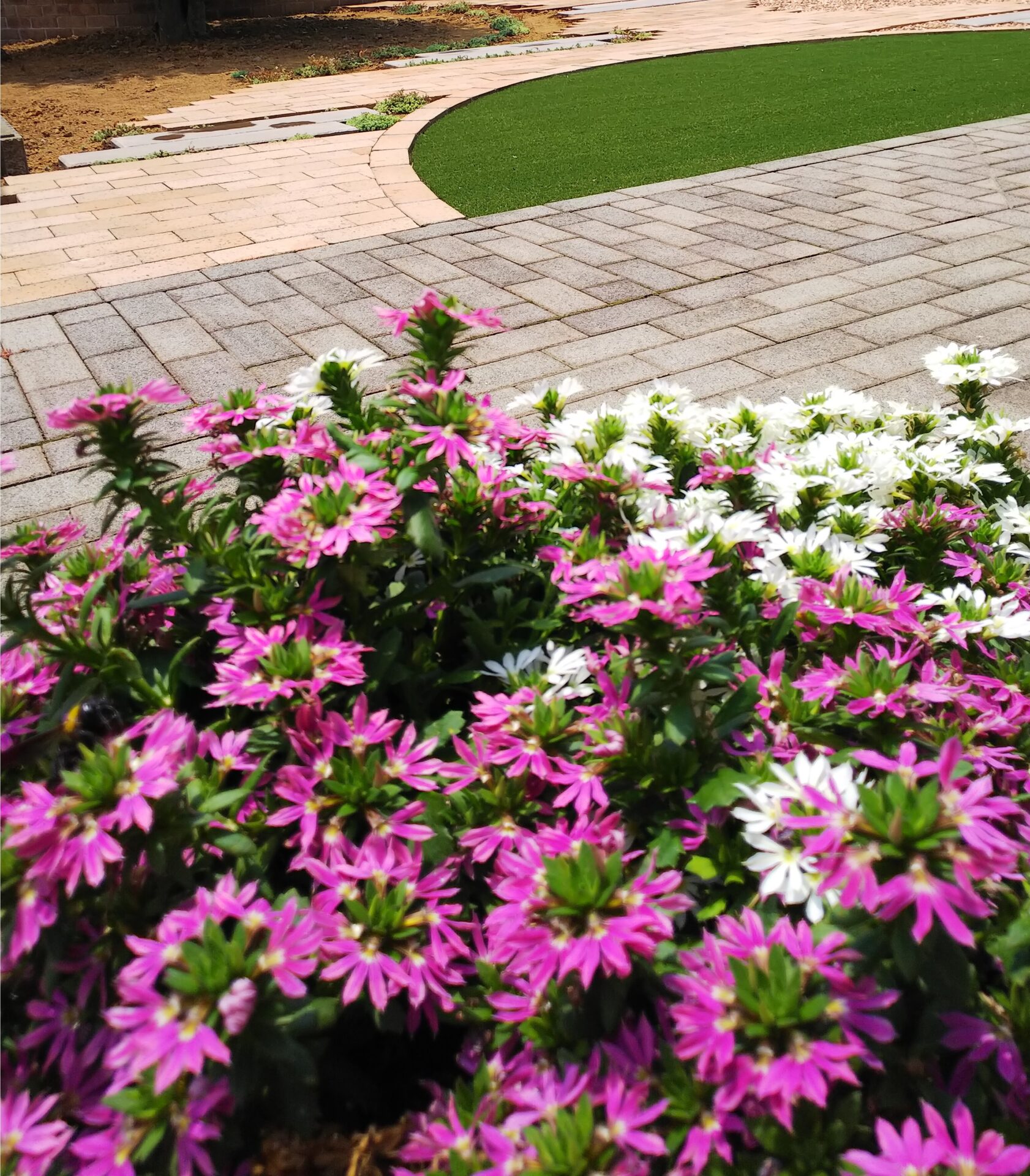 今、土の部分もお花や下草で緑がいっぱいになり、O様ご自身やお客様を楽しませてくれることでしょう。