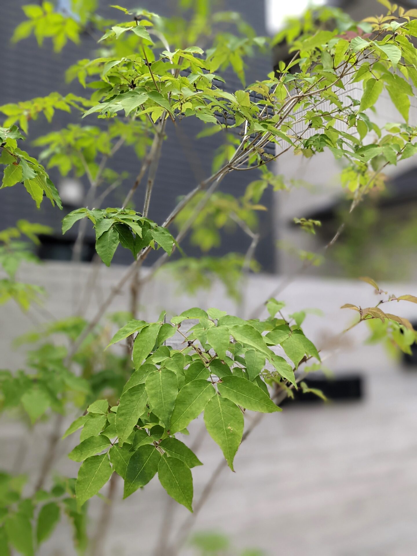 シックな建物外観に杉板模様の門柱、 植物を組み合わせることで柔らかい印象に仕上がりました。