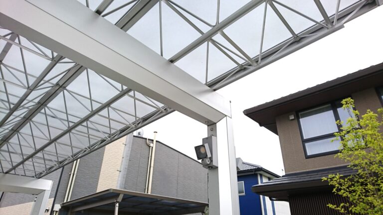 華やかで個性のあるファサードに取り入れたカーポートは3次元プレートトラス構造がかっこいい「M.シェード」。