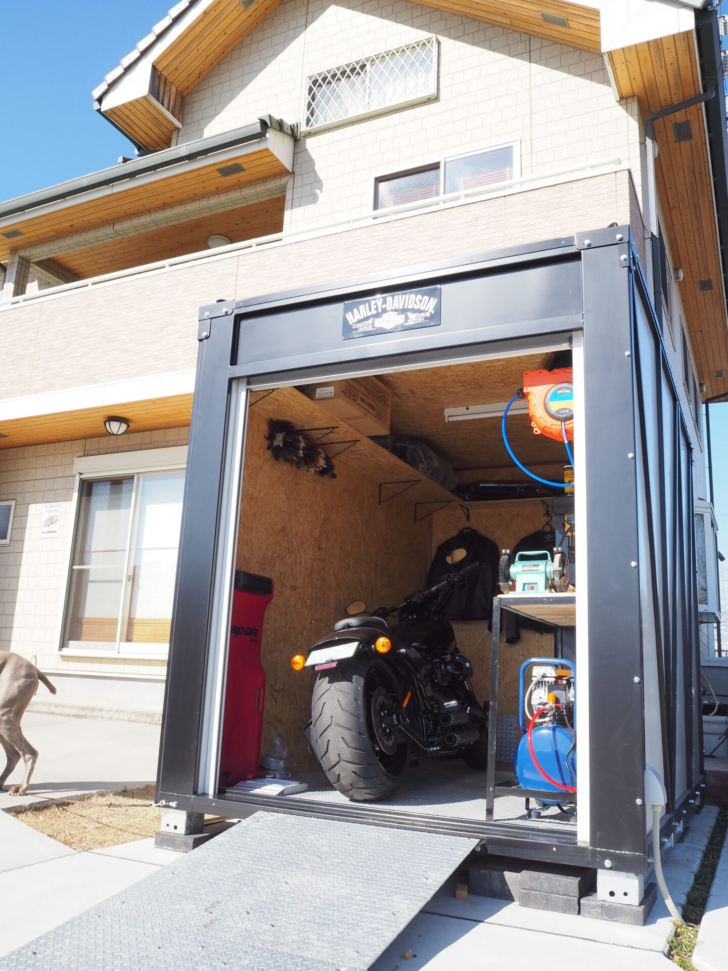 購入済の大型バイクが入ること、そして既にお持ちの大きな工具入れが入るシャッター付きガレージを採用しました。